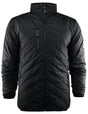 Mens’ quilted lightweight jacket. Fully lined with hidden hood inside the collar (invisible zip). Reversed coil zip at centre front, and pockets. Elastic binding at bottom hem and sleeves. Jacket can be tucked into the front pocket which transforms into its own storage pouch. Invisible zip on the inside for ease of decoration.