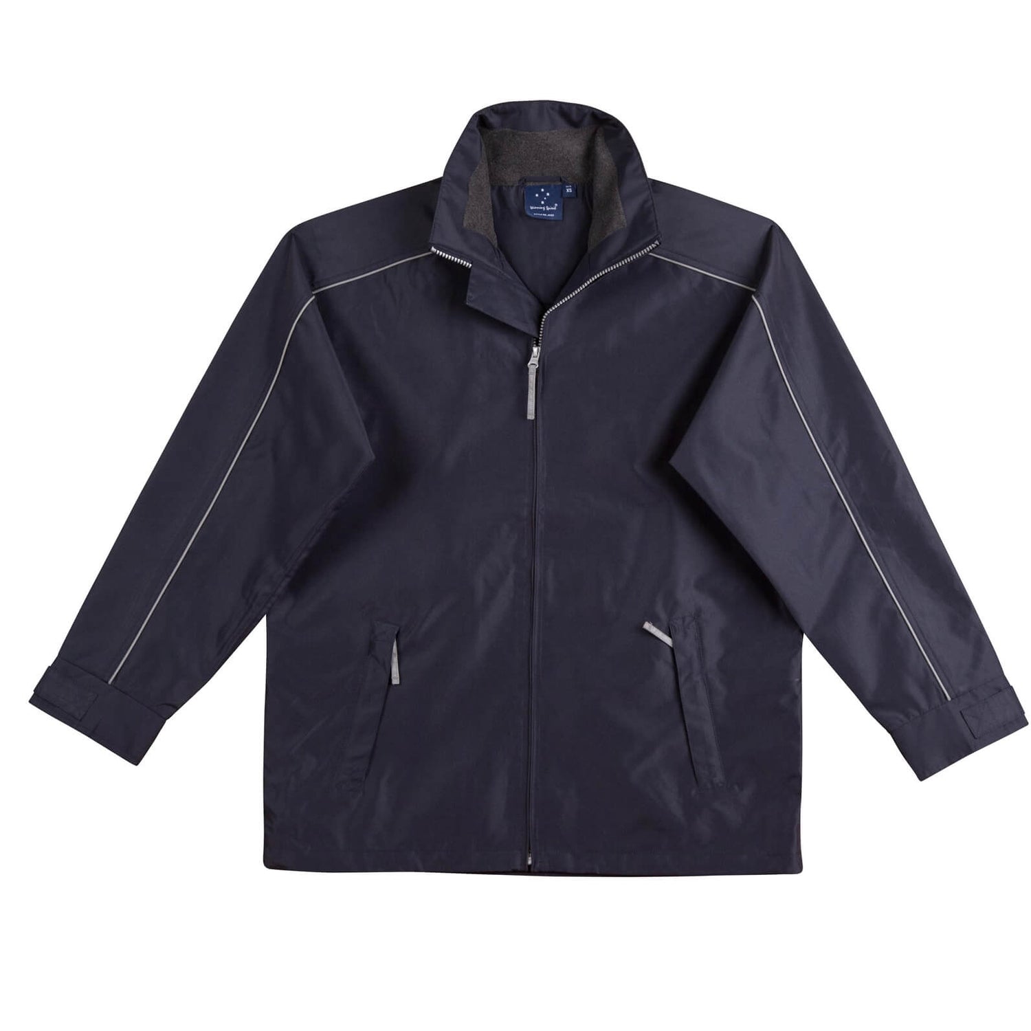 Description: Water repellent Oxford shell jacket with silver reflective piping, charcoal colour fleece lined collar, inside mesh lining. Double front & inside pockets. Hidden draw cord at the hem of jacket Hidden mobile phone pocket in front. Inside back lining can be opened for easy access to chest & back embroidery. Adjustable velcro cuffs