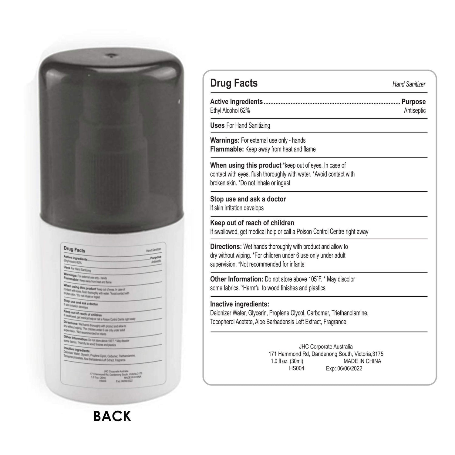 30ml lightly scented spray hand sanitizer in a white plastic bottle with a black lid, pump action to apply, contains 62% alcohol and kills 99.9% of bacteria and germs, meets FDA requirements, small and handy to carry in a hand bag.