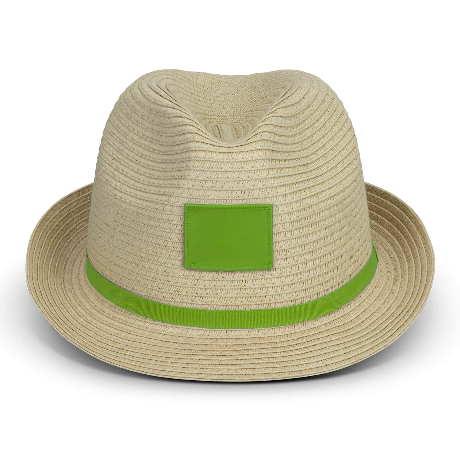 Classic paper weave fedora hat with a coloured polyester ribbon which features a patch for convenient and prominent branding.