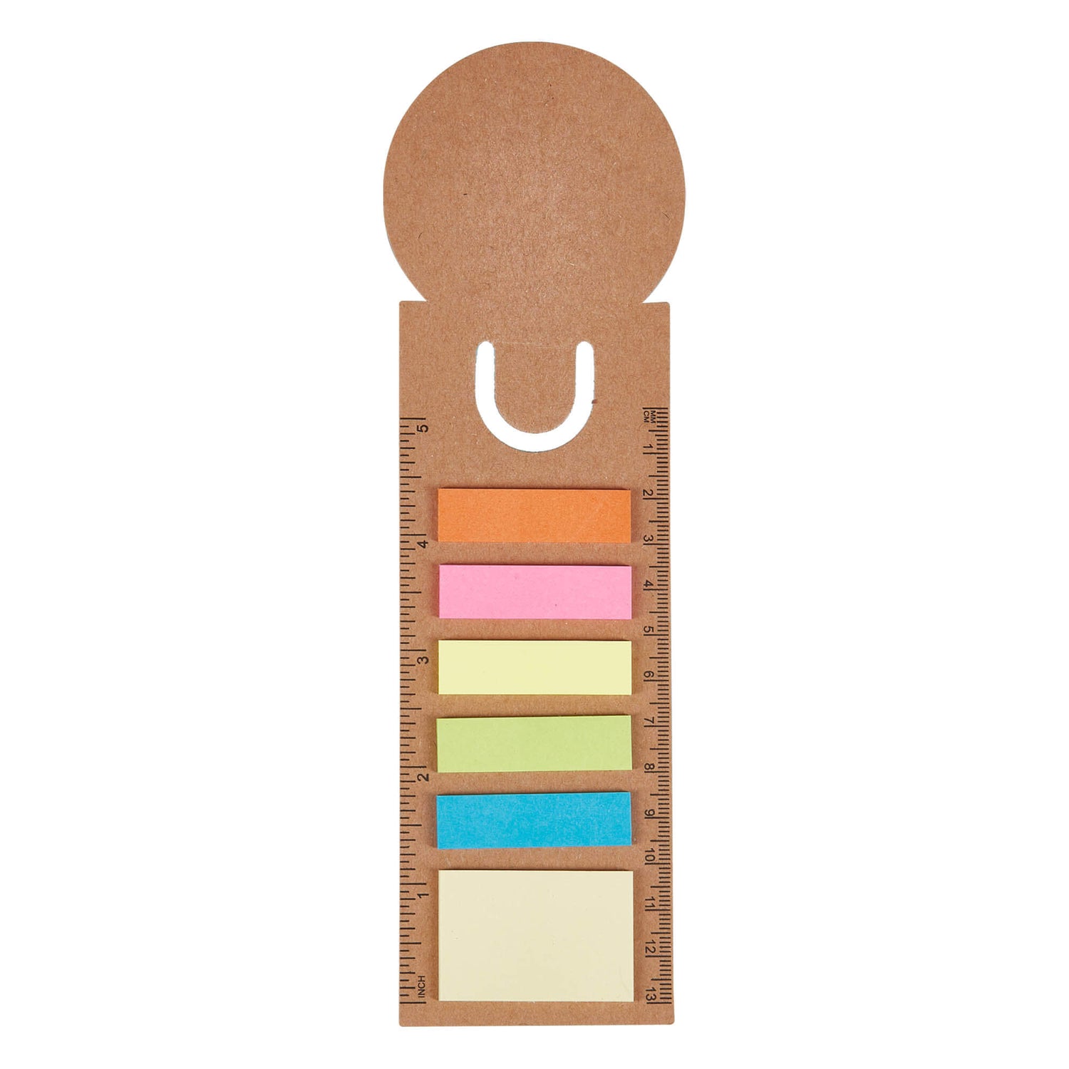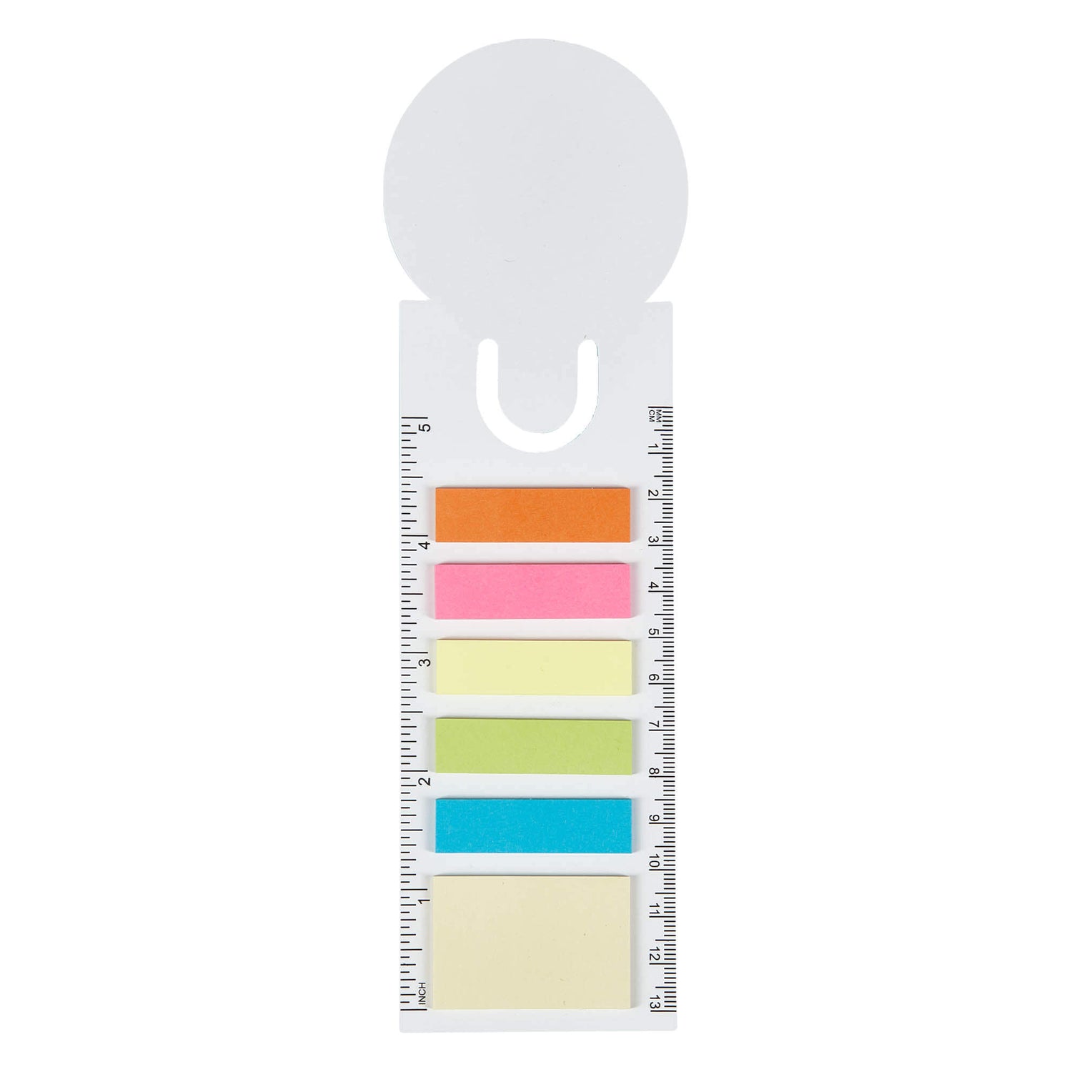 A cardboard bookmark ruler with a round printing area. A block of 25 leaves adhesive note pad (40 mm x 28 mm) and 5 block of 25 leaves of adhesive paper note flags (Blue, Green, Yellow, Pink, Orange).