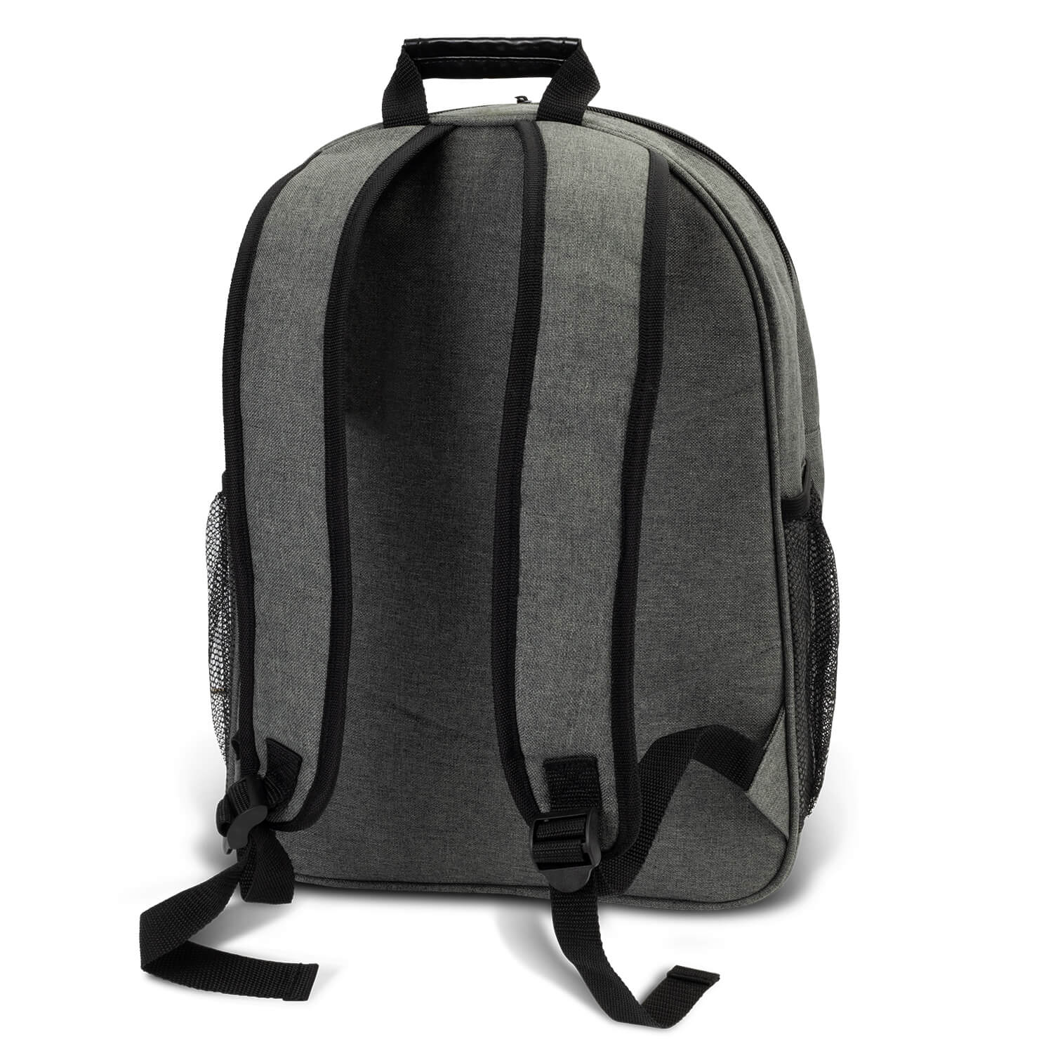 Fashion-Inspired backpack which is manufactured from poly-canvas with an on-trend heather style finish with a PU strip. It has padded woven straps that are adjustable, a padded back and a padded internal laptop compartment. Other features include a large zippered concealed pocket on the front, two mesh side pockets and a woven carry handle.