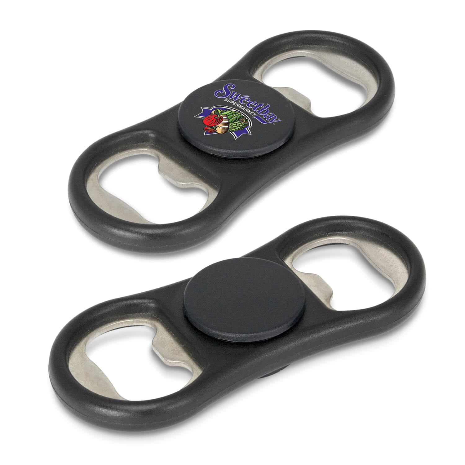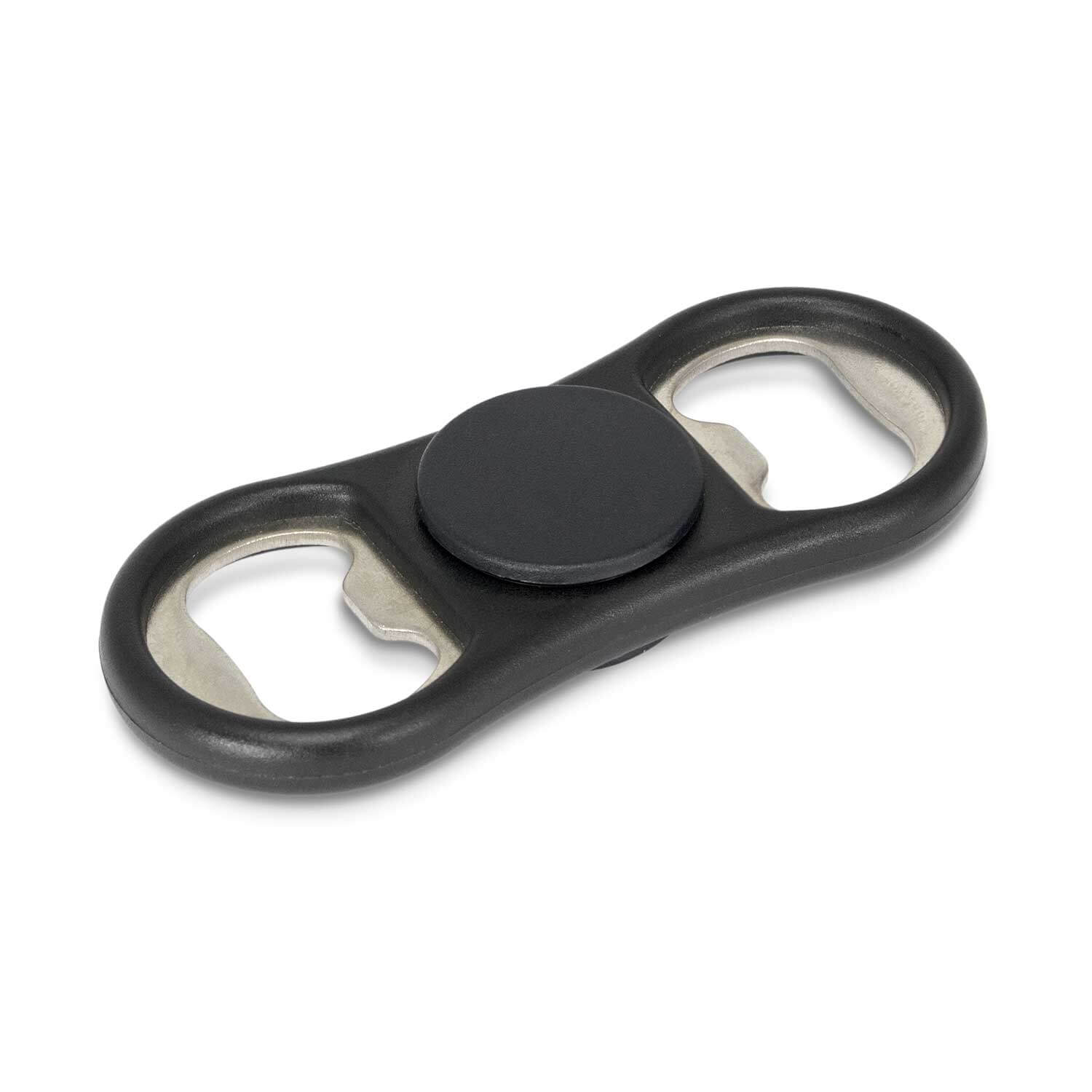 Novelty double-ended plastic and metal bottle opener which can also be used as a stress relieving fidget spinner. It complies with AS/NZS 8124.1.2016 (Safety of Toys) standard.