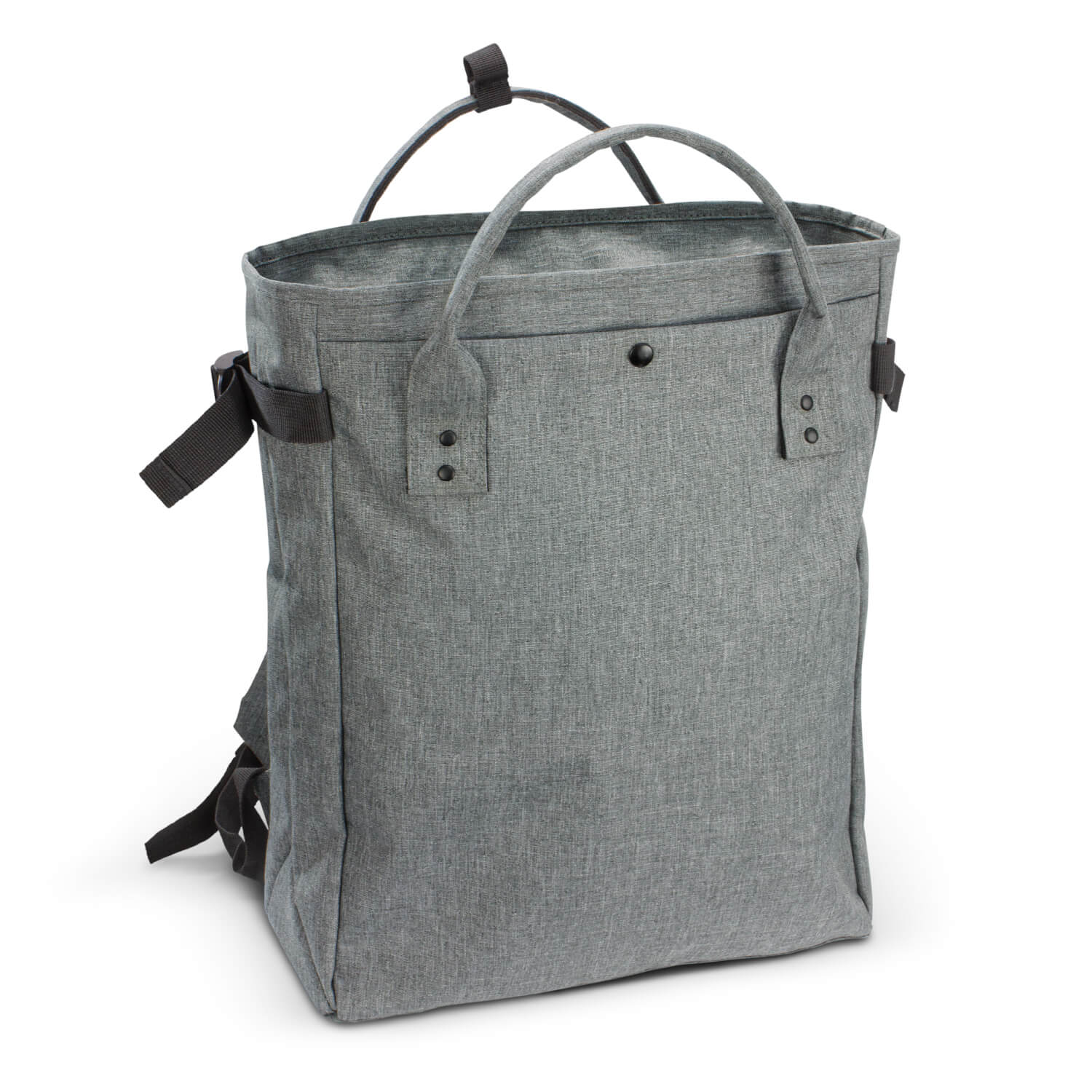 • Extra-large tote bag that can also be worn as a backpack. The bag is manufactured from 300D polyester with a two-tone heather style finish. Newport features a zippered top closure, a front slip pocket with a domed closure, and a zipper to access the main compartment from the back of the bag. The bag has a gusset for increased storage, adjustable side straps and padded shoulder straps and carry handles that are riveted to the bag for added strength.