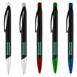 Click action matt black plastic pen with metallic coloured push button and unique oblique shape tip. A stylish design of clip and barrel will surely outstand your corporate logo. High quality cross-type refill with German manufactured black ink and tungsten carbide ball which brings you the better writing quality, 1200 meters writing distance. Add this great design pen to your list for next event.