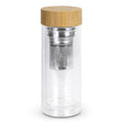 Elegant 350ml, double-wall borosilicate glass bottle which maintains hot or cold drink temperatures for longer and remains comfortable to hold. It has a removable stainless-steel infuser for tea or fruit and a secure screw on bamboo lid. The bottle is BPA-free and is manufactured from borosilicate glass which is incredibly light and very strong. Bamboo is a natural material which produces unavoidable variances in the grain pattern, colour, and branding. This product is not dishwasher safe, and handwashing is recommended.